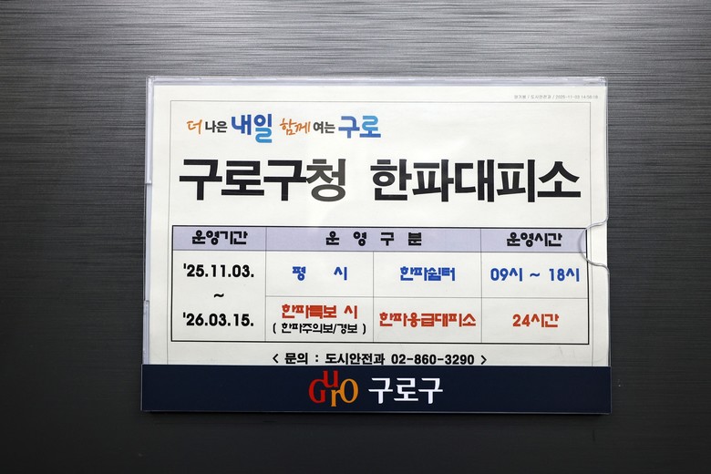 한파쉼터 및 응급대피소 위치와 운영시간 등 자세한 사항은 구로구 누리집과 누리소통망(SNS)을 통해 확인할 수 있으며, 문의는 도시안전과(02-860-3290)로 하면 된다.