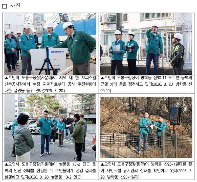 이후에는 쌍문동 13-2와 방학동 산90-11을 찾아 도로변 옹벽의 균열·변형 여부와 배수 상태를 살폈다. 끝으로 방학동 산25-1, 산27-2일대 점검에서는 사방시설 유지관리 상태를 중점 확인했다.