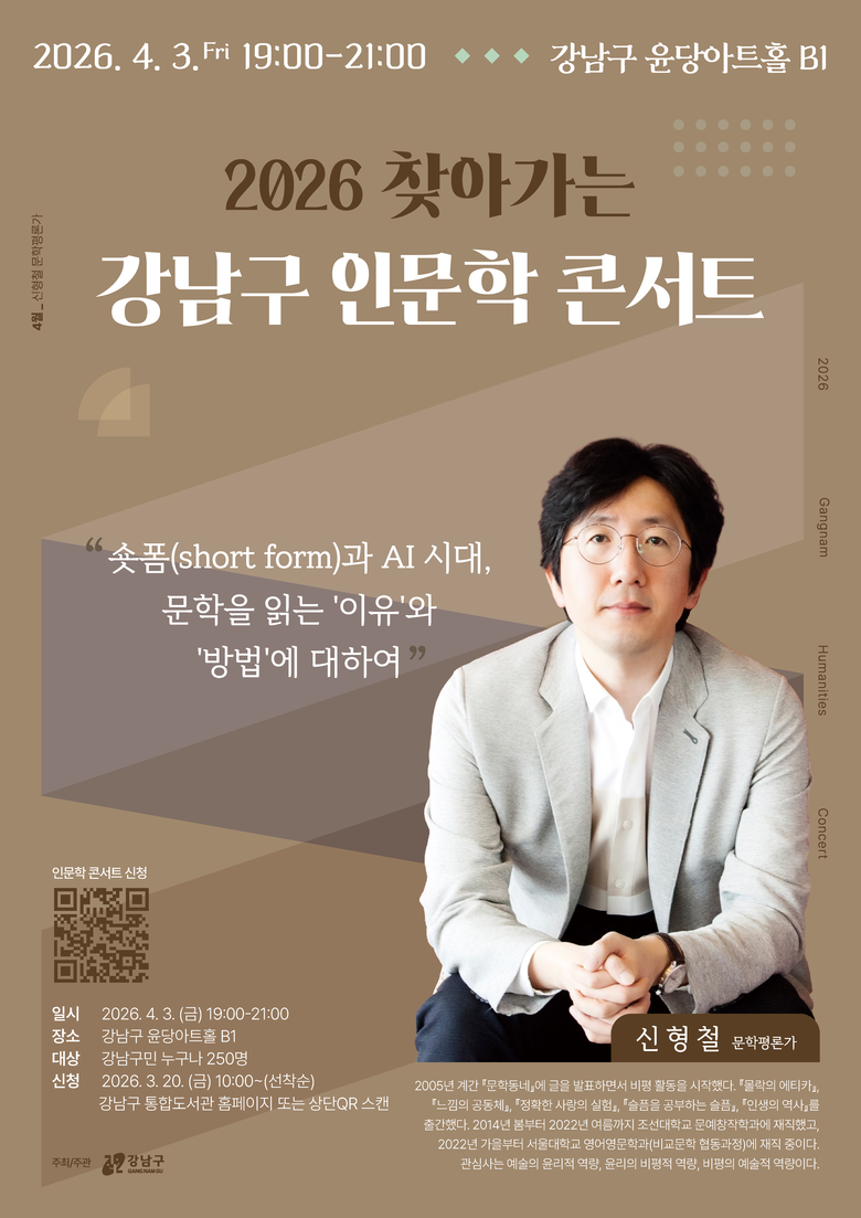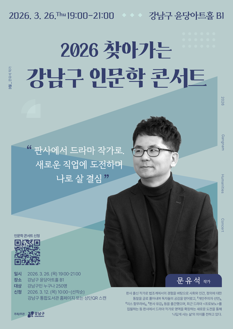 조성명 강남구청장은 “빠르게 변하는 시대일수록 인문학은 스스로를 돌아보고 삶의 방향을 가다듬는 힘이 된다”며 “강연과 공연, 대화가 함께하는 이번 인문학 콘서트를 통해 구민 여러분이 통찰과 위로를 얻고, 일상 가까이에서 문화의 즐거움도 함께 누리시길 바란다”고 말했다.