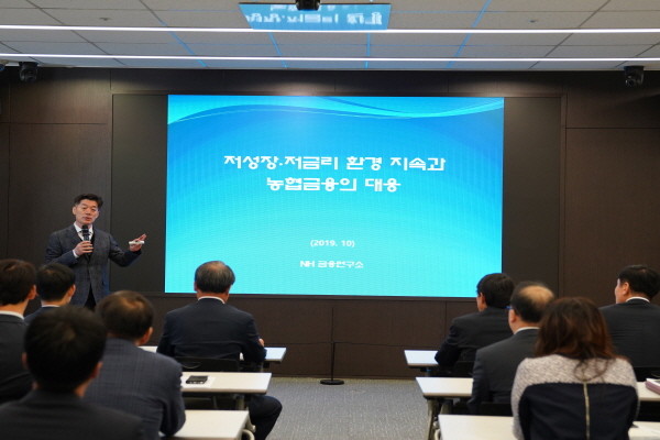 NH금융연구소 송두한 소장은 저금리가 금융산업에 미치는 영향 및 금융시장 불확실성 증가에 따른 국내 주가·환율 변동성 확대, 중소기업금융 및 자영업 현황 등에 대해 분석했다.
