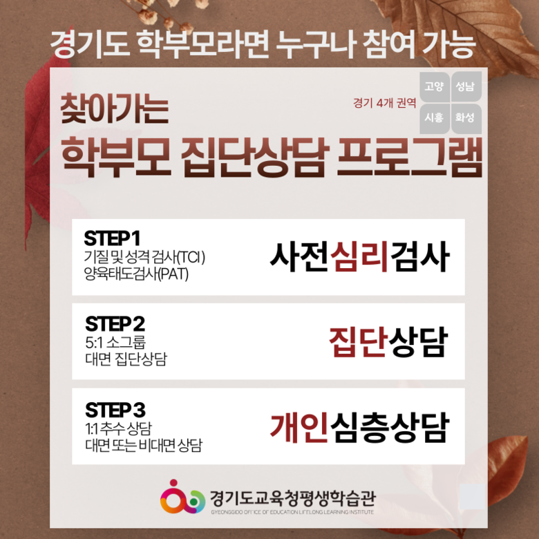 23일부터 고양을 시작으로 성남, 시흥, 화성 등 경기도 내 4개 권역에서 순차적으로 진행되는 이번 프로그램은 전문 상담사와의 소그룹 (5:1) 상담을 통해 학부모가 서로 경험을 공유하고 정서적 안정을 도모할 수 있도록 기획됐다.