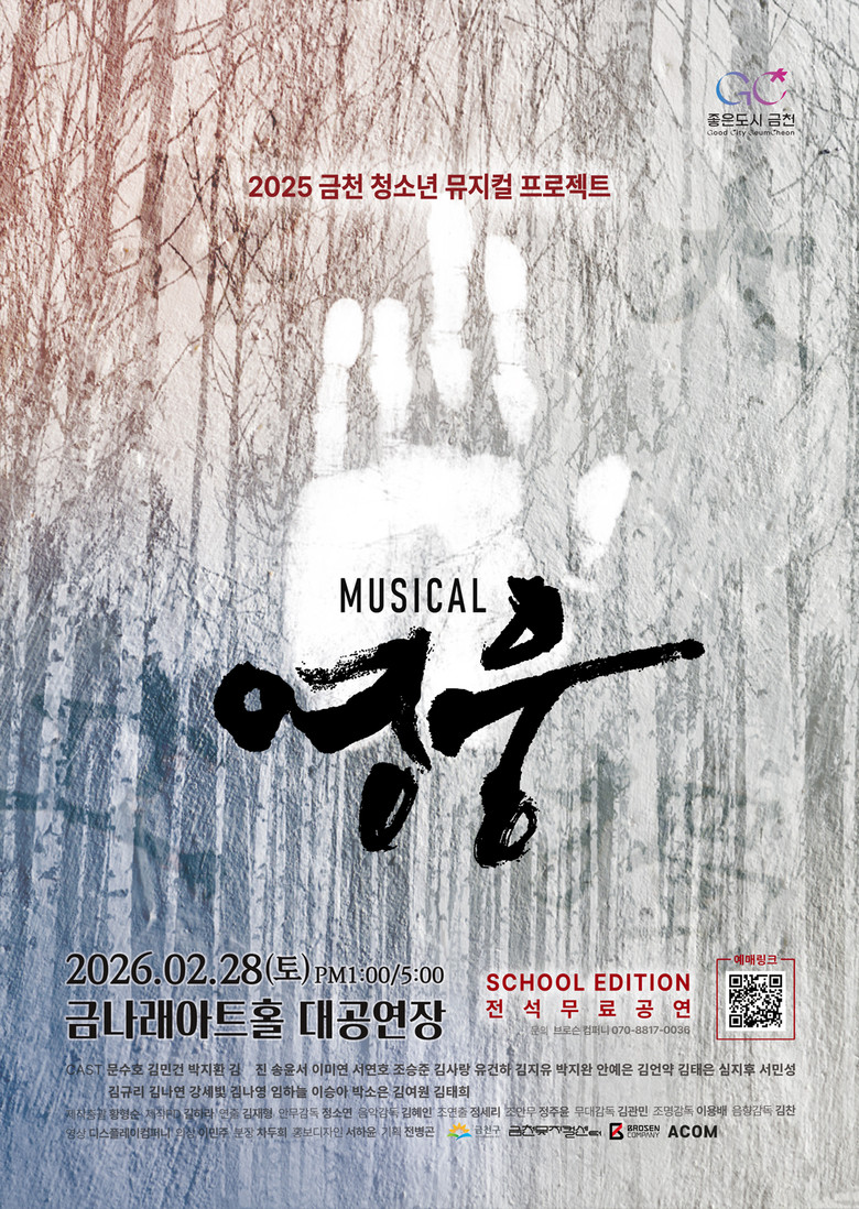 - 항일 독립 영웅 안중근 의사의 삶과 동지들의 숭고한 사명 주제 [금천구 세계타임즈=이장성 기자] 금천구(구청장 유성훈)는 금천 청소년 뮤지컬 프로젝트 ‘영웅’이 오는 28일 금나래아트홀 대공연장에서 개최된다고 밝혔다.