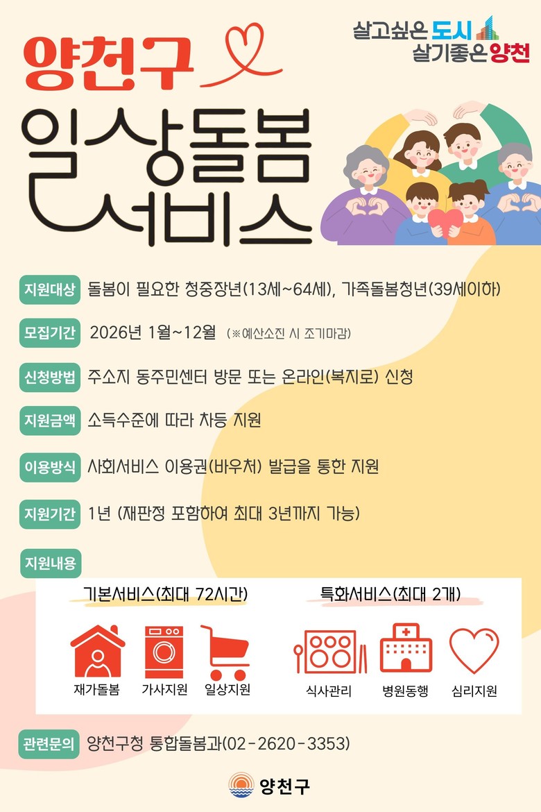 – 가사지원부터 병원동행·식사지원·심리지원까지...1:1 맞춤형 생활밀착 돌봄 제공 [양천구 세계타임즈=이장성 기자] 양천구(구청장 이기재)는 일상생활에 어려움을 겪는 청·중장년과 가족돌봄청년을 더욱 두텁게 지원하기 위해 2026년부터 ‘일상돌봄 서비스’를 확대 시행한다고 10일 밝혔다.