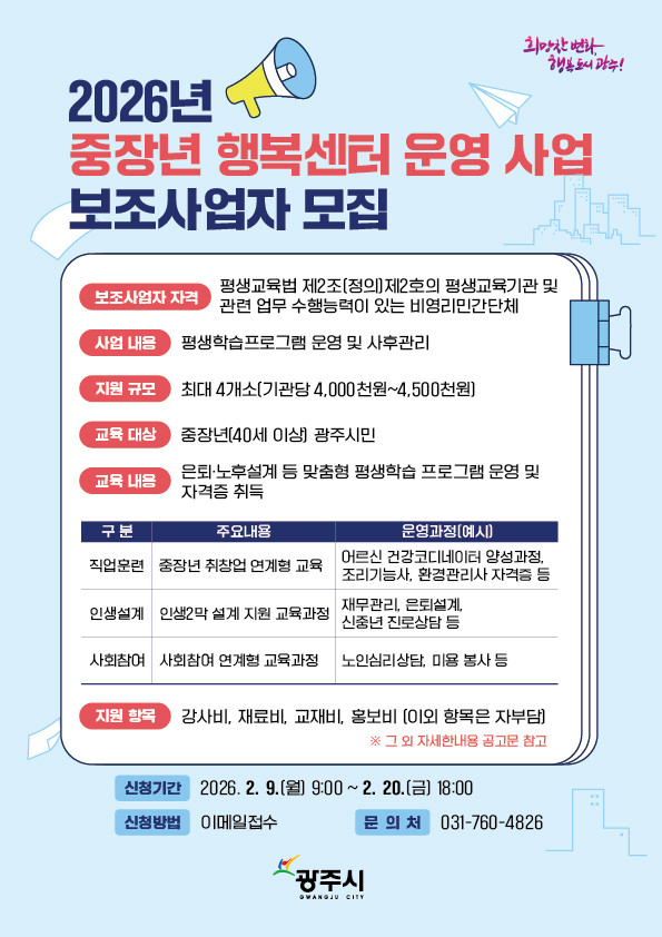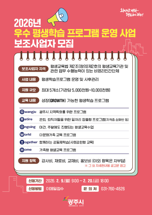 한편, 신청서 양식과 접수 방법 등 세부 사항은 광주시청 홈페이지 공고문(제2026-383호, 제2026-384호)을 통해 확인할 수 있다.
