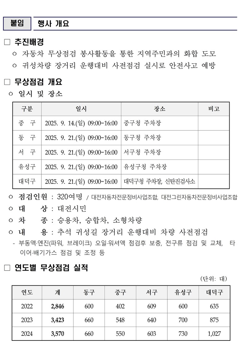 한편, 대전시는 2022년 2,846대, 2023년 3,423대, 2024년 3,570대의 차량을 점검하는 등 매년 꾸준히 실적을 올려왔다. 올해는 점검 규모를 확대해 더 많은 시민들이 혜택을 받을 수 있을 것으로 기대된다.