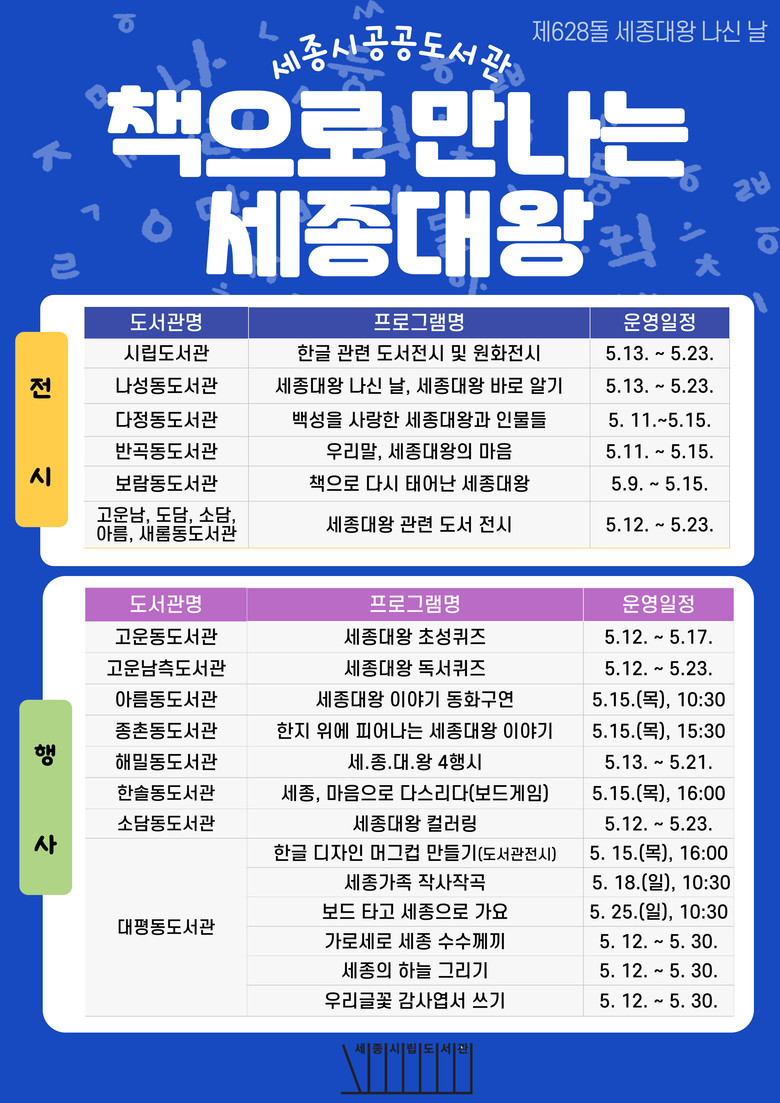 전시 행사에는 세종시립도서관을 포함한 10개 도서관이 전시하는 세종대왕·한글 관련 도서를 통해 세종대왕의 삶과 정신을 책으로 만나볼 수 있다.