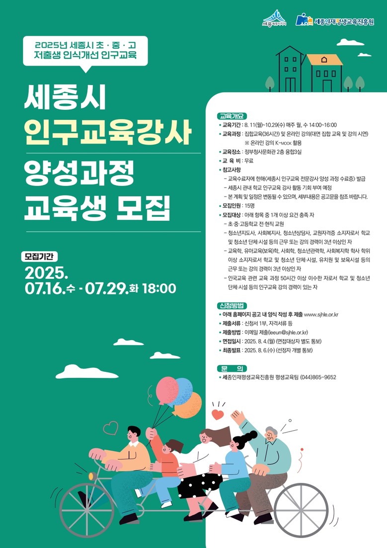 모집 기간은 오는 7월 29일까지이며, 신청은 세종인재평생교육진흥원 누리집(www.sjhle.or.kr)에서 접수할 수 있다.