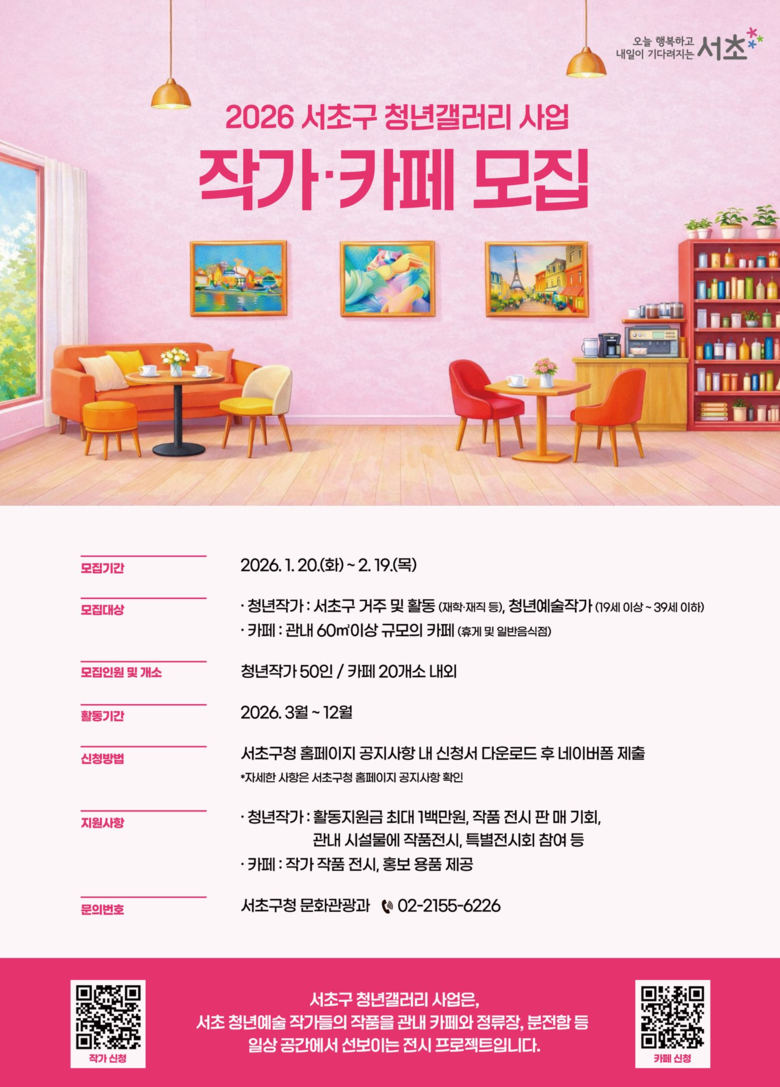 모집은 서초구에 거주하거나 활동 중인 만 19세 이상 39세 이하의 청년예술작가를 대상으로 1월 19일부터 2월 19일까지 진행되며, 전문가 심사를 거쳐 참여 작가 50명을 선정한다. 올해는 참여 작가 수를 조정하는 대신, 지역 내 시설 등으로 전시 공간을 단계적으로 확대할 계획이다.