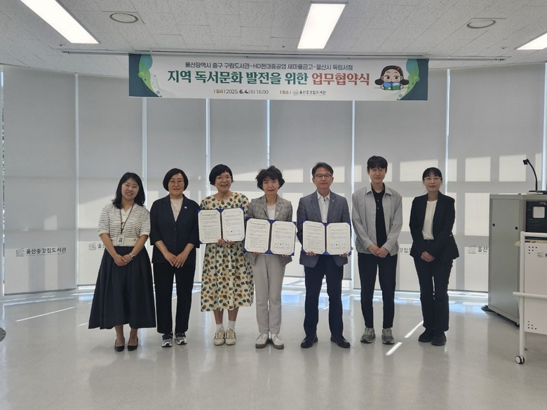 [중구 세계타임즈=이호근 기자] 울산 중구(구청장 김영길)에서 운영하는 울산종갓집도서관과 HD현대중공업새마을금고(이사장 권태수), 울산 지역 독립서점 5곳이 지난 6월 4일(수) 오후 4시 울산종갓집도서관 강의실에서 지역 독서문화 발전을 위한 업무협약을 맺었다.