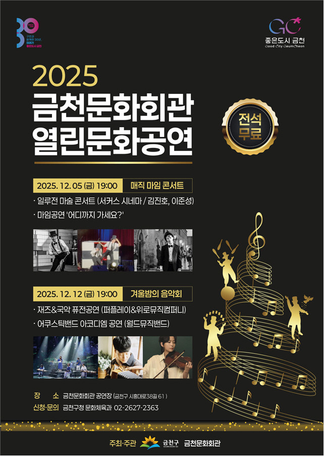 - 매직 마임 콘서트, 겨울밤의 음악회 등 크리스마스 시즌 맞춤 기획공연 진행 [금천구 세계타임즈=이장성 기자] 금천구(구청장 유성훈)는 오는 12월 5일과 12월 12일 오후 7시, 두 차례에 걸쳐 금천문화회관에서 기획공연 ‘2025 금천문화회관 열린문화공연’을 개최한다고 밝혔다.