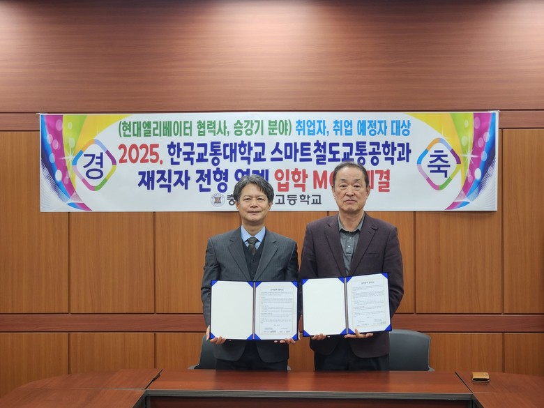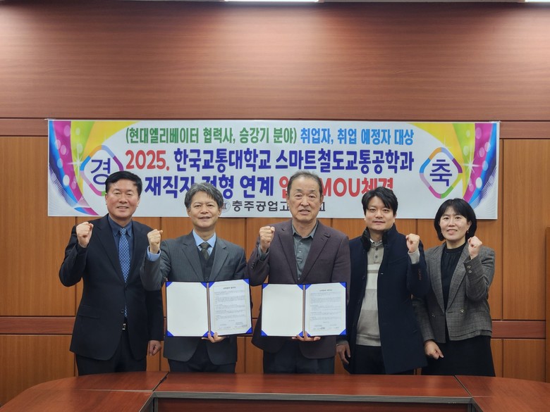 [충북 세계타임즈=이현진 기자] 충주공업고등학교(교장 장영)는 14일(금), 한국교통대학교 스마트철도교통공학과(학과장 강정원)과 철도, 승강기, 모빌리티 전문가 양성을 위해 재직자 전형 연계 입학 MOU를 체결하였다.
