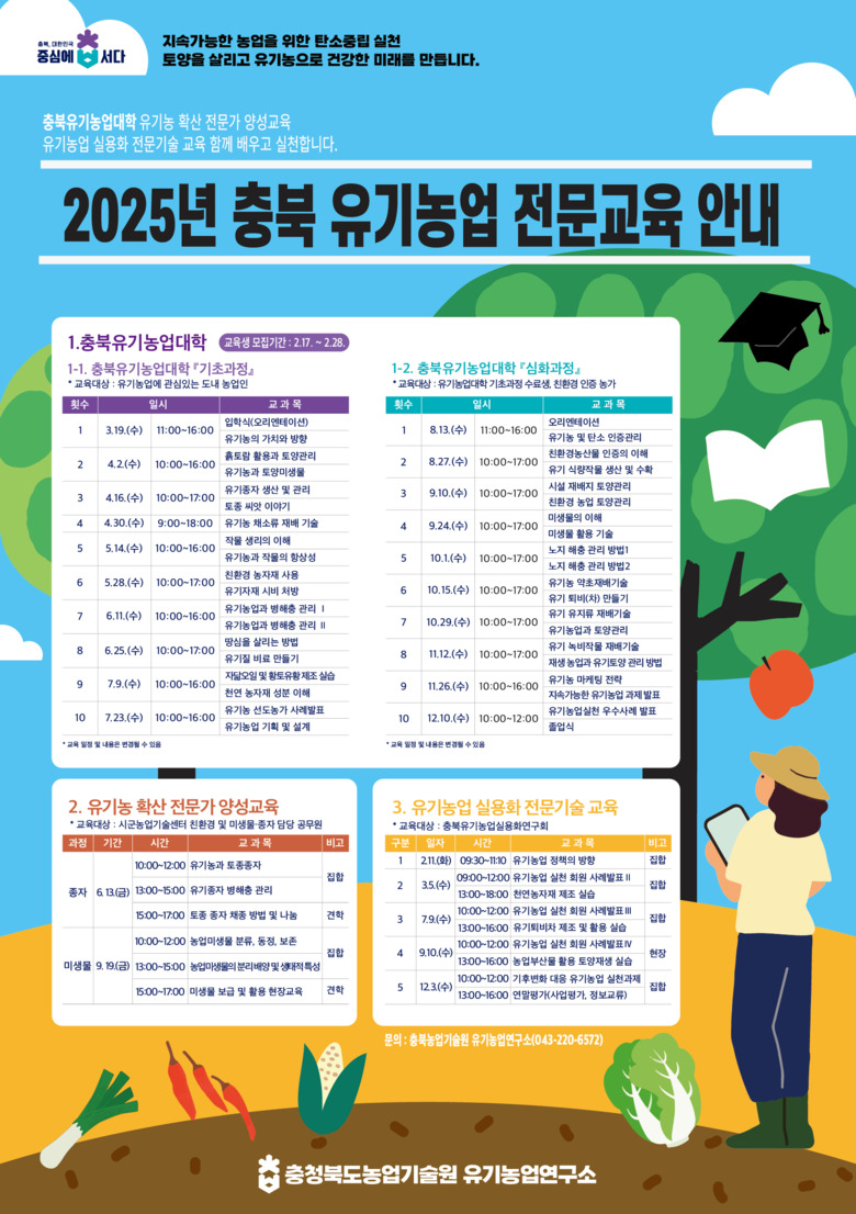 한편, 충북유기농업대학은 2016년 유기농업연구소 개소와 함께 유기농업 전문 인력 양성을 위해 개설된 교육과정으로, 2024년까지 총 569명의 졸업생을 배출했다.