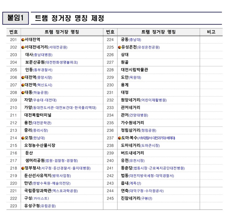 최종수 대전시 도시철도건설국장은 “정거장 명칭 고시는 트램 정거장 명칭의 통일성을 확보하고, 개통 전 시민들에게 사전 인지도 상승효과를 기대할 수 있게 됐다”라고 말했다.