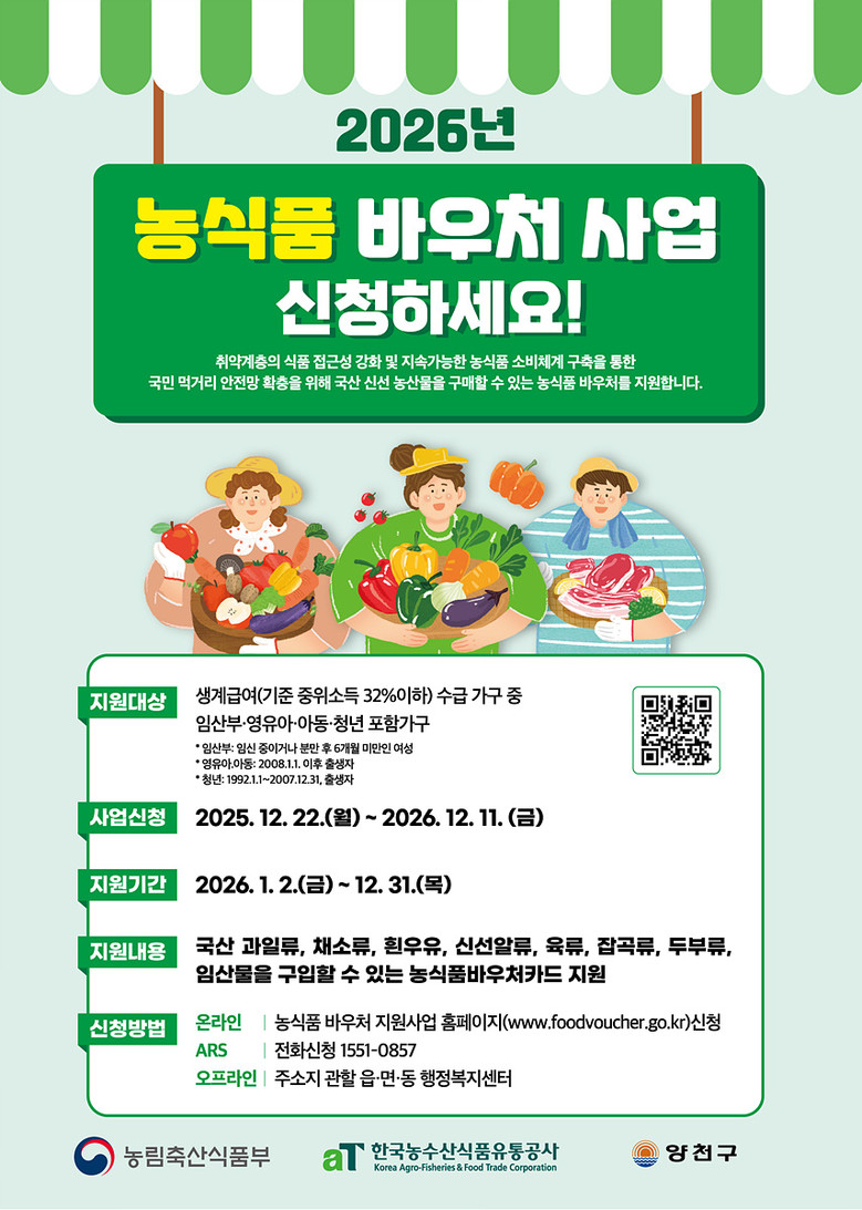 이기재 양천구청장은 “최근 고물가가 계속되고 있어 저소득층이 먹거리 걱정 없이 건강한 식생활을 유지할 수 있도록 농식품 바우처를 지원하고 있다”며 “올해부터 지원 대상이 확대되는 만큼 청년을 포함한 대상 가구가 빠짐없이 혜택을 받을 수 있도록 적극적인 신청을 바란다”고 말했다.