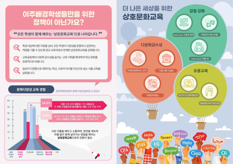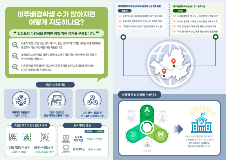 초밀집학교 학급당 학생 수 감축·보호자 교육 대폭 강화 [서울 세계타임즈=이장성 기자] 서울특별시교육청(교육감 정근식)은 이주배경학생 증가에 따른 교실 환경 변화에 대응하기 위해 「2026 서울 이주배경학생 교육지원 및 다문화교육 종합계획」을 발표했다.
