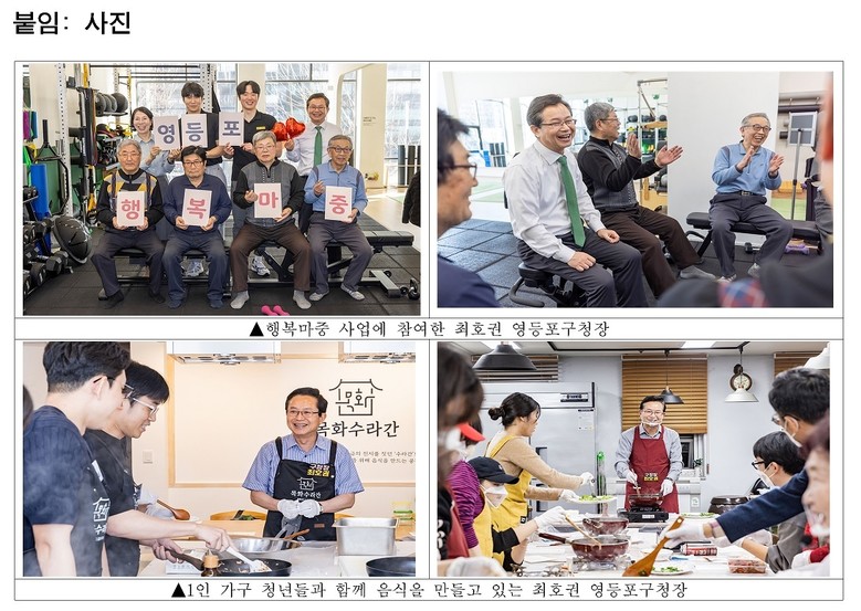 청년과 중장년 등 1인 가구를 위한 안전망 구축에도 힘을 쏟고 있다. 최근 사회적 문제로 주목받고 있는 ‘은둔 청년’을 위해 ‘회색청년 관계회복 프로그램’을 운영해 지난해 70명의 청년들이 사회에 복귀할 수 있도록 도왔으며, 자립 준비 청년들을 위한 전용공간 ‘우인’도 운영하고 있다. 이 외에도 ‘01러닝클럽’, ‘따뜻한 한 끼 나눔-온(溫)누리’, ‘영등포 한바퀴’ 등 1인 가구의 사회적 관계 형성을 돕는 다양한 프로그램도 운영 중이다.