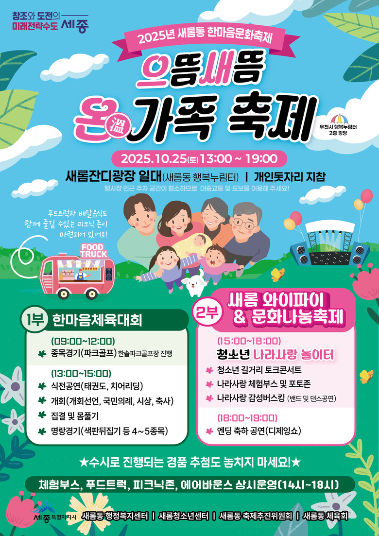 이번 축제는 새롬동 주민과 지역 기관·단체가 함께하는 가족 참여형 문화행사로 모든 세대가 함께 즐기며 화합하고 추억을 나눌 수 있는 기회를 제공하기 위해 마련됐다.
