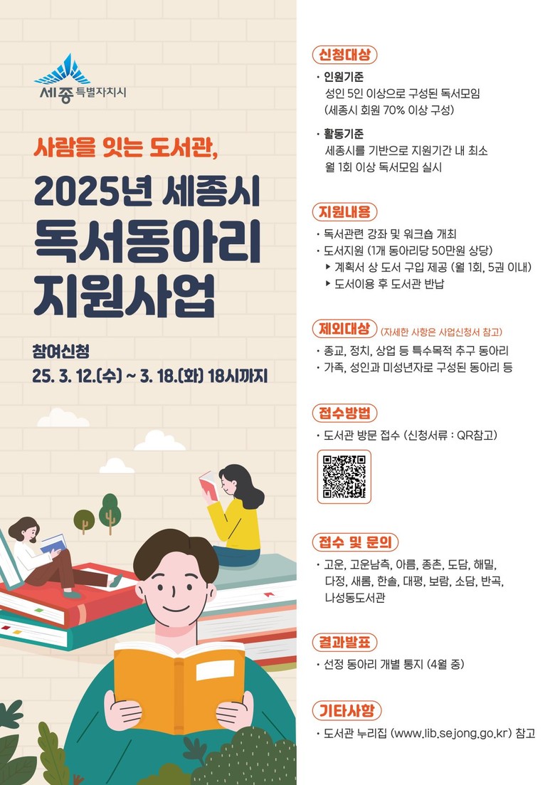 지원 대상은 세종시에 거주하는 성인 5명 이상으로 구성된 독서모임으로, 동아리 구성원의 70% 이상이 세종시 주민이어야 한다.