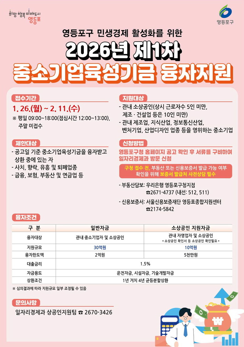 최호권 영등포구청장은 “자금 지원은 경영의 버팀목이 되고, 판로 지원은 기업 성장의 발판이 된다”라며 “소상공인과 중소기업이 현장에서 체감할 수 있는 지원 정책을 지속적으로 추진해 나가겠다”라고 전했다.