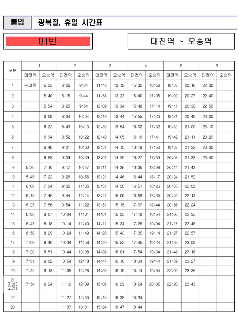 15일 광복절과 주말 동안 급증할 것으로 예상되는 교통 수요에 대응하고, 탑승객 증가로 인한 무정차 통과를 방지하기 위해 증편을 실시한다. 이에 따라 B1 노선은 기존 평균 13분 간격에서 10분 간격으로 단축 운행되며, 대전역 기준 첫차는 오전 5시 30분, 막차는 밤 11시 40분에 출발한다. 오송역 기준 첫차는 오전 5시 20분, 막차는 밤 11시 30분이다.