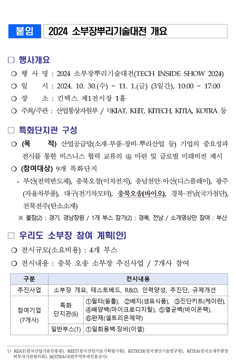 충북도는 특화단지관 4개 부스, 기본부스 1개를 운영하며 샘표식품, 마이크로디지탈, 움틀, 바이온팩, 셀트리온제약, 이앤에스헬스케어, 이셀 등 바이오 소부장 7개사가 참석한 가운데 필터, 배지, 배양백, 진단키트 등 각 기업 제품 및 바이오의약품 소부장 특화단지를 홍보할 계획이다.