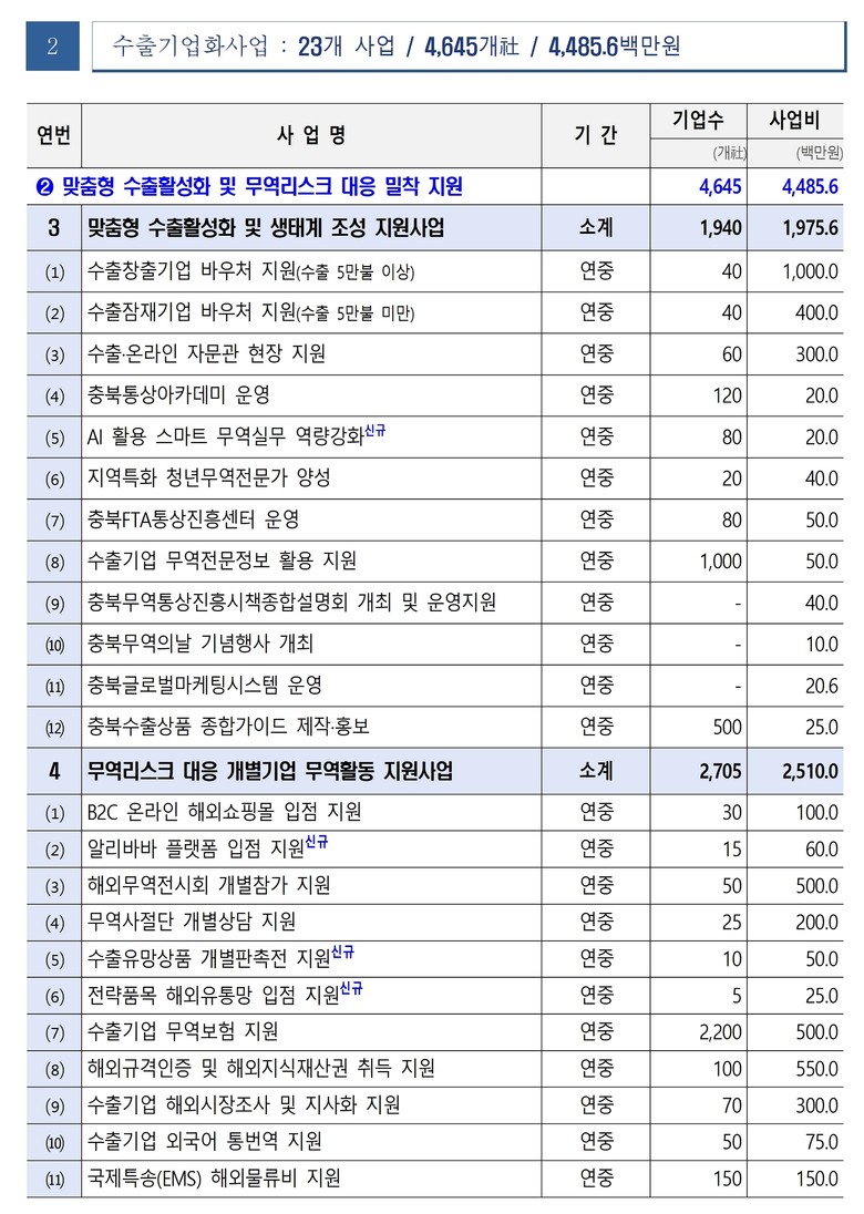 한편, 충북도는 지난 한 해 47개 무역통상사업을 통해 5,258개 수출기업을 지원하여 바이어 수출상담, 미국발 관세로 인한 무역리스크 대응 등 해외 진출과 판로 확대를 적극 뒷받침했다.