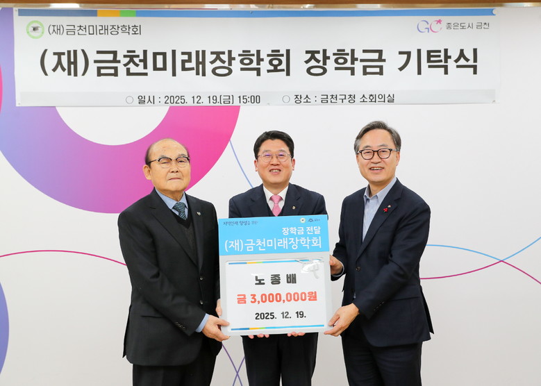 - 노종배 씨 300만 원 기탁 [금천구 세계타임즈=이장성 기자] 금천구(구청장 유성훈)는 12월 19일 (재)금천미래장학회에서 금천청소년 CEO창업단, 남헌모 님, 노종배 님의 장학금 기탁식을 개최했다고 밝혔다.