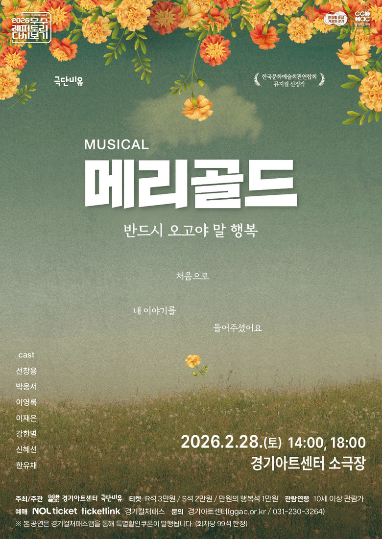 또, 경기아트센터 소극장에서 공연하는 뮤지컬 ‘메리골드’ 관람 할인 문화소비쿠폰이 지원된다. 공연은 오는 28일 토요일 오후 2시와 6시 총 2회 진행되며, 좌석 등급은 R석(3만 원), S석(2만 원), 만원의 행복석(1만 원)으로 구성된다.