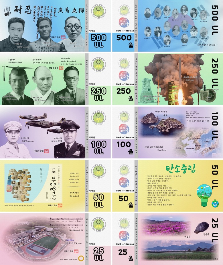 UL 화폐는 주요 권종별로 한국의 자랑스러운 역사와 인물들을 담고 있어 그 의미를 더한다. ▲최고액권인 500UL에는 안중근, 윤봉길, 김구 선생의 사진과 친필이 앞면에, 3·1운동에 참여한 10대 독립투사들의 초상과 태극기가 뒷면에 새겨져 있다. ▲250UL은 앞면에 윤동주, 한용운, 이육사 시인의 사진과 그들의 시 일부가 담겨 있으며, 뒷면에는 첨성대, 누리호, 측우기, 앙부일구 등 한국 과학유산이 도안으로 활용되었다. ▲100UL, 50UL, 25UL에는 6·25전쟁의 호국영웅, 독도, 학교의 마음교육 상징과 교정 전경 등이 담겨 있다.