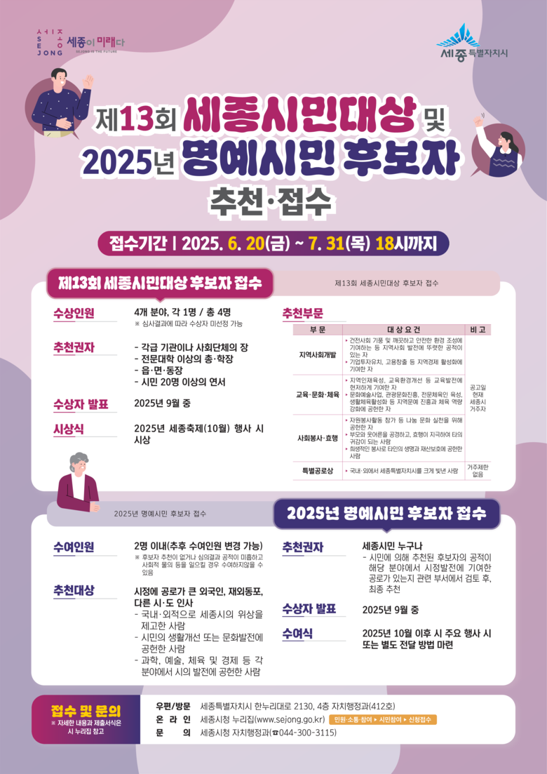 시는 20일부터 내달 31일까지 ‘제13회 세종시민대상’과 ‘2025년 명예시민’ 후보자 접수를 진행한다.