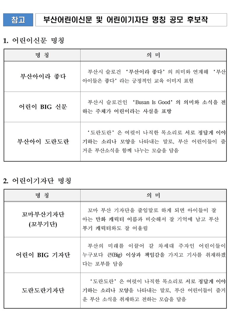 어린이신문 명칭 후보작은 ▲‘부산아이라 좋다’ ▲‘어린이 빅(BIG) 신문’ ▲‘부산아이 도란도란’이고, 어린이기자단 명칭 후보작은 ▲‘꼬마부산기자단(꼬부기단)’ ▲‘어린이 빅(BIG) 기자단’ ▲‘도란도란기자단’이다.