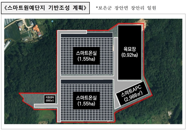 이번 공모사업 선정을 통해 총사업비 39억 원 중 70%에 해당하는 20억 원을 국비로 확보하였다. 보은군은 이와 연계하여 스마트온실 3.11ha, 공동육묘장 0.92ha, 스마트APC 0.29ha를 조성하고, 향후 ‘스마트농업 육성지구’도 조성하여 원예 스마트팜의 집적화·규모화를 단계적으로 확장 추진할 계획이다.