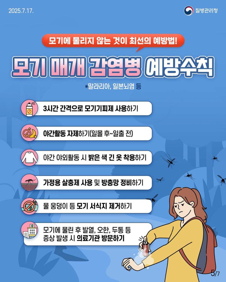 외출 시에는 모기 기피제를 3∼4시간 간격으로 사용하고, 실내로 모기가 침입하지 못하도록 방충망을 점검하는 등 모기에 물리지 않도록 예방 수칙을 준수해야 한다.