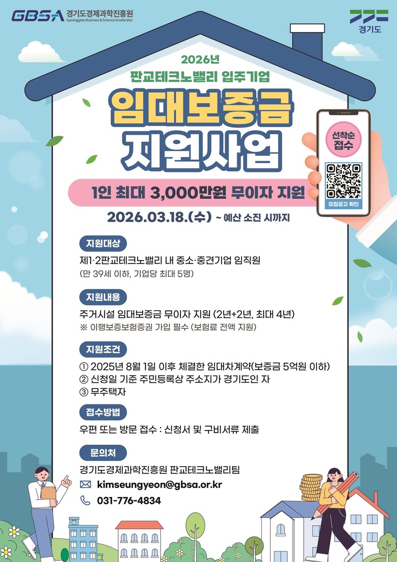 ‘2026년 판교테크노밸리 입주기업 임대보증금 지원사업’은 제1·2판교테크노밸리 입주 중소·중견기업 재직자를 대상으로 최대 3천만 원의 임대보증금을 최장 4년간 무이자로 지원한다.