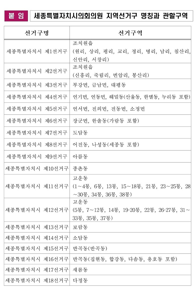 또한 올해 하반기 개청이 예정된 집현동을 반곡동과 분리해 각각 제15·16선거구로 조정했다.