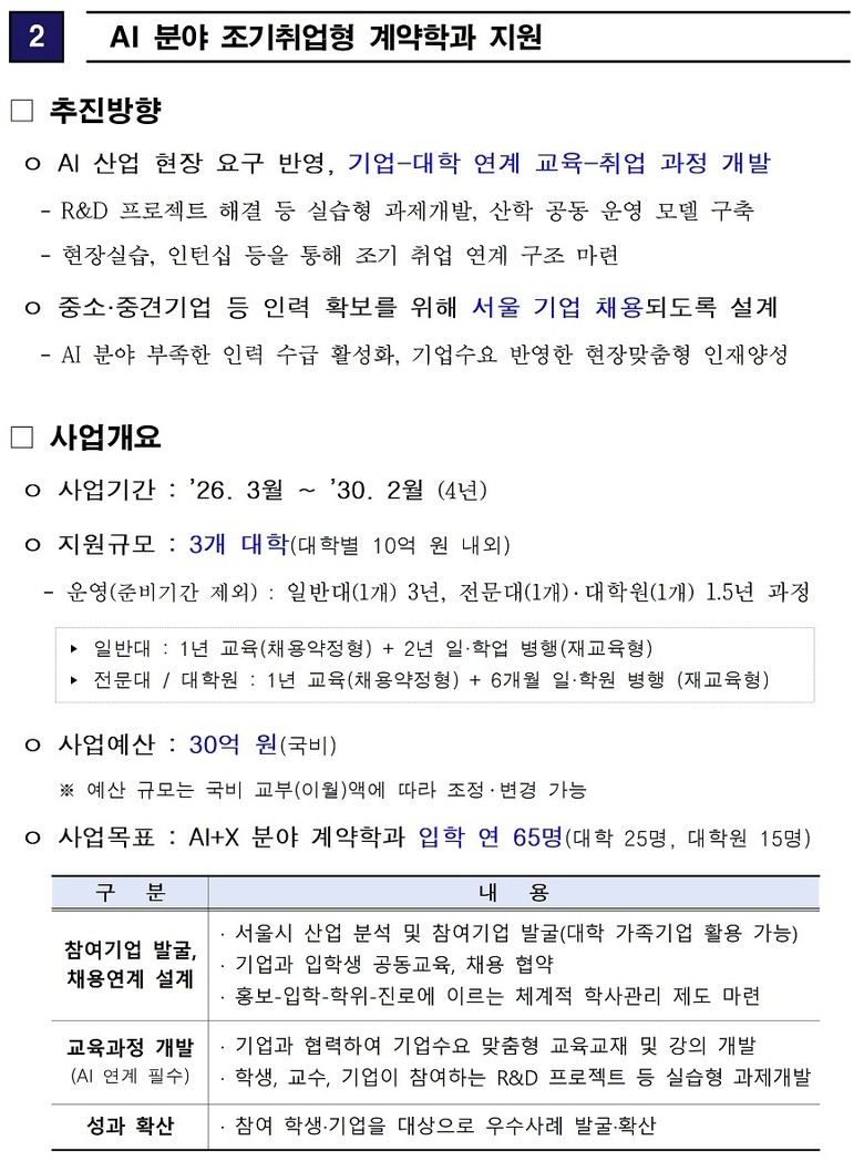 ○ (AI 분야 조기취업형 계약학과) AI 산업 수요에 부합하는 맞춤형 인재를 조기에 양성하고 기업의 인력난 해소와 청년 일자리 창출을 도모한다. 총 3개 대학, 대학별 10억 원을 지원(총 30억 원)한다. 취업 안전성을 고려하여 중간평가 없이 4년간 지원한다.