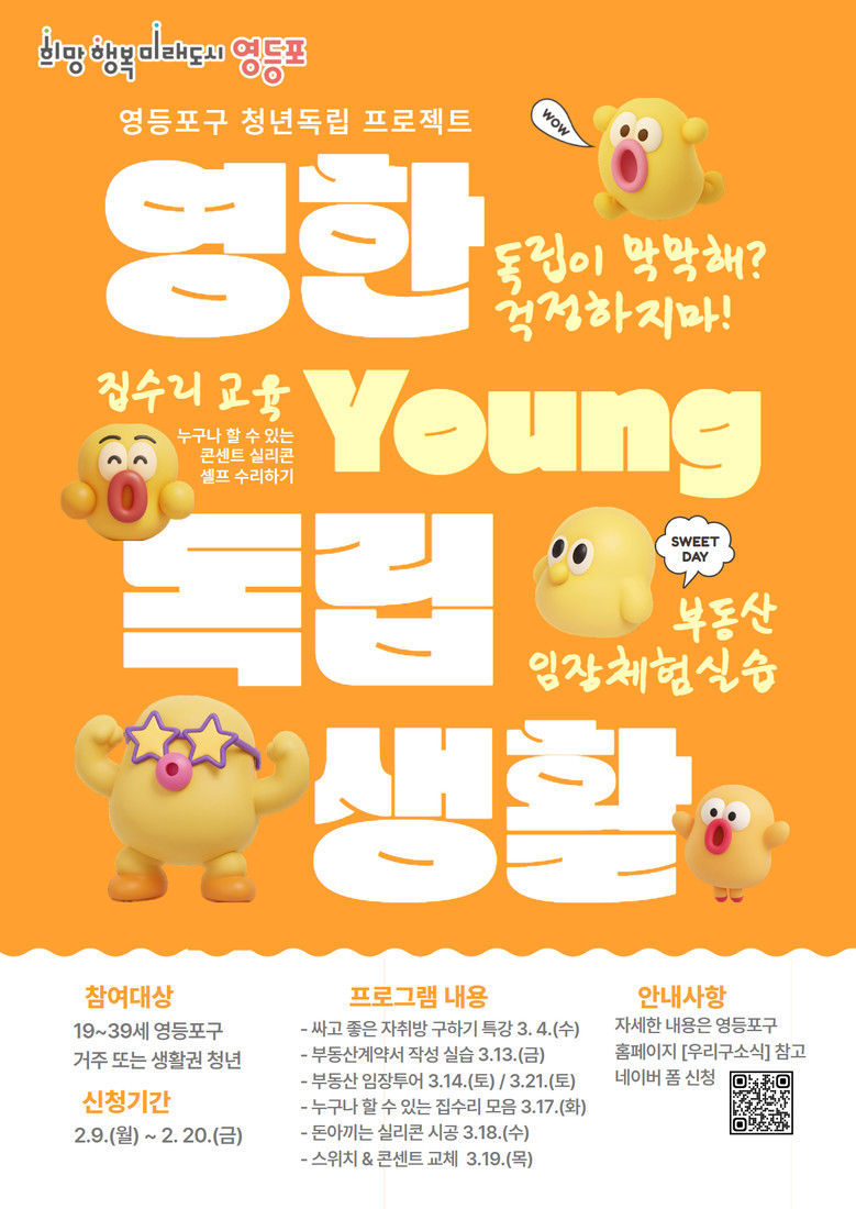 모집 대상은 영등포구에 거주하거나 영등포구를 생활권으로 하는 만 19세~39세 청년으로, 총 100명 내외를 선발한다. 영등포구 거주자를 우선 선발하며, 신청 기간은 2월 9일부터 2월 20일까지다. 참여를 희망하는 청년은 홍보 포스터의 정보무늬(QR코드)를 통해 신청할 수 있다. 자세한 사항은 영등포구청 누리집 ‘우리구소식’ 게시판을 참고하면 된다.