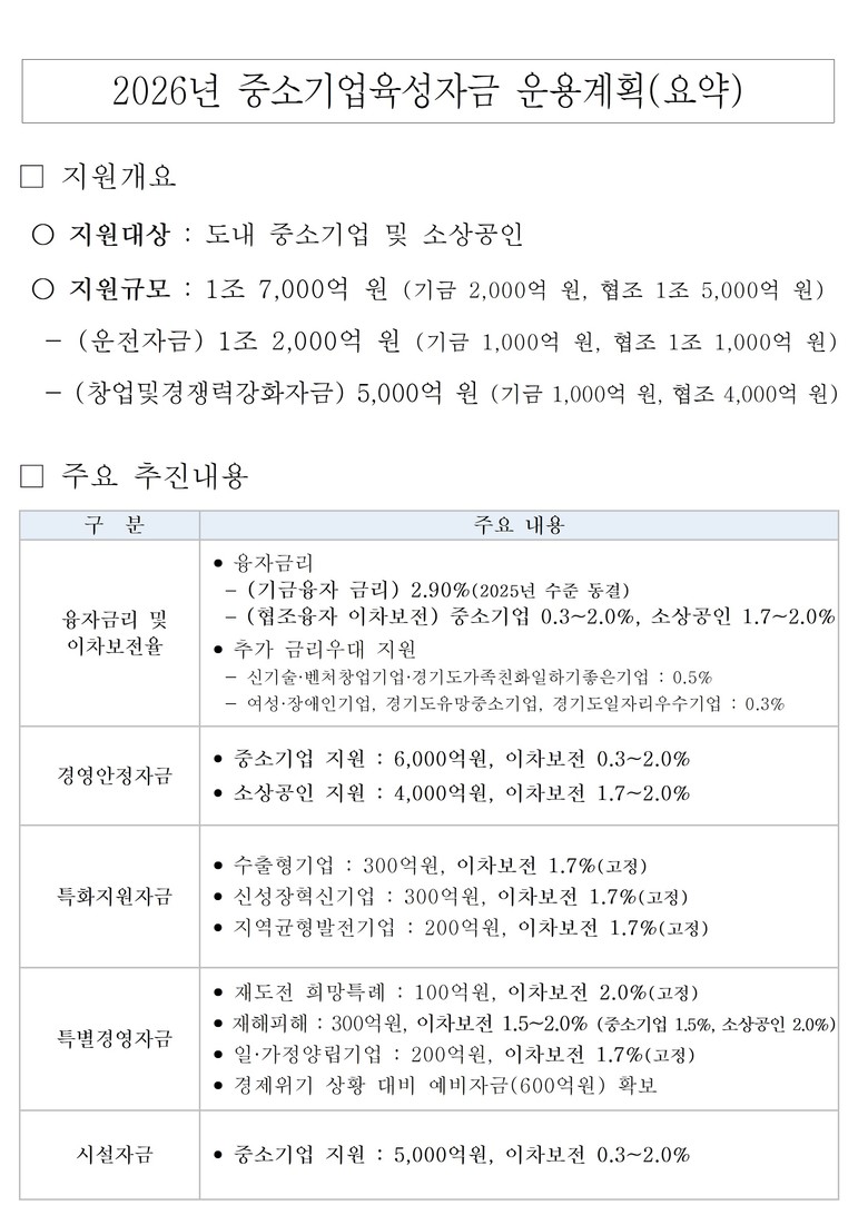 [경기도 세계타임즈=송민수 기자] 경기도는 중소기업과 소상공인 경영 안정을 지원하기 위해 ‘2026년도 중소기업 육성자금’을 총 1조 7천억 원 규모로 공급한다고 7일 밝혔다.