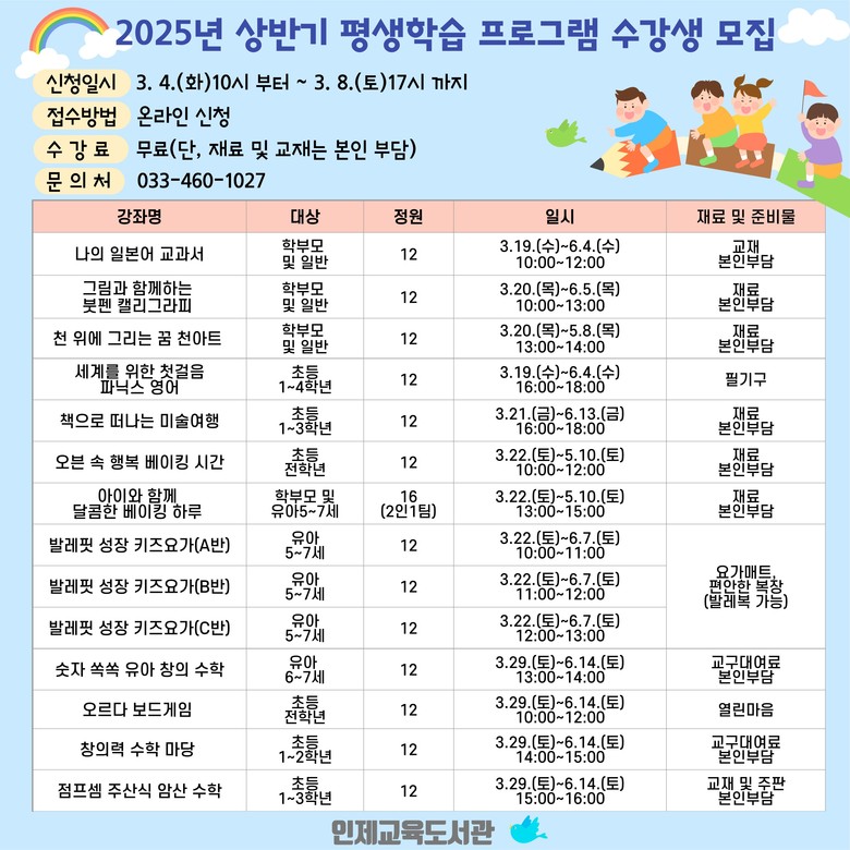 상반기 평생학습 프로그램은 유아, 학생, 학부모 대상 총 14개 강좌가 운영되며, 수강 신청은 3월 4일(화)부터 8일(토)까지 인제교육도서관 누리집을 통해 할 수 있다.