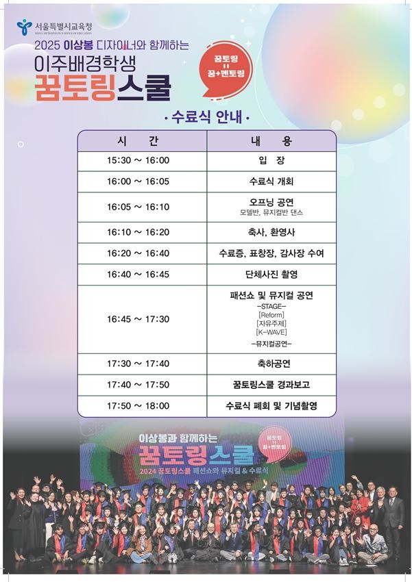 이상봉 등 명장 멘토링부터 교육감 ‘깜짝 무대’까지...편견 넘은 화합의 축제 [서울 세계타임즈=이장성 기자] 서울특별시교육청(교육감 정근식)은 오는 12월 20일, 다양한 문화적 배경을 가진 청소년들이 예술로 하나 되는 「2025 전문가와 함께하는 이주배경학생 꿈토링스쿨」수료식을 개최한다.