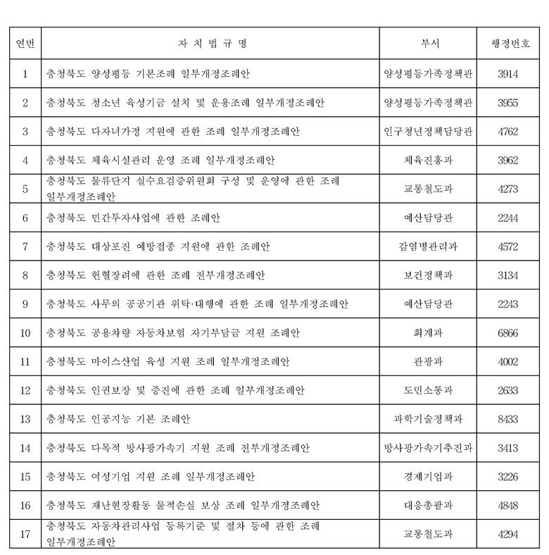 [충북 세계타임즈=이현진 기자] 충북도는 도민의 생활 안정과 지역경제 발전를 위한 다양한 조례를 제ㆍ개정하여 시행한다고 밝혔다. 이번에 시행되는 조례들은 10월 22일 제429회 충청북도의회 임시회에서 통과되었으며, 모두 17건으로, 제정 4건, 개정 13건이며, 오는 11월 중 공포ㆍ시행될 예정이다.