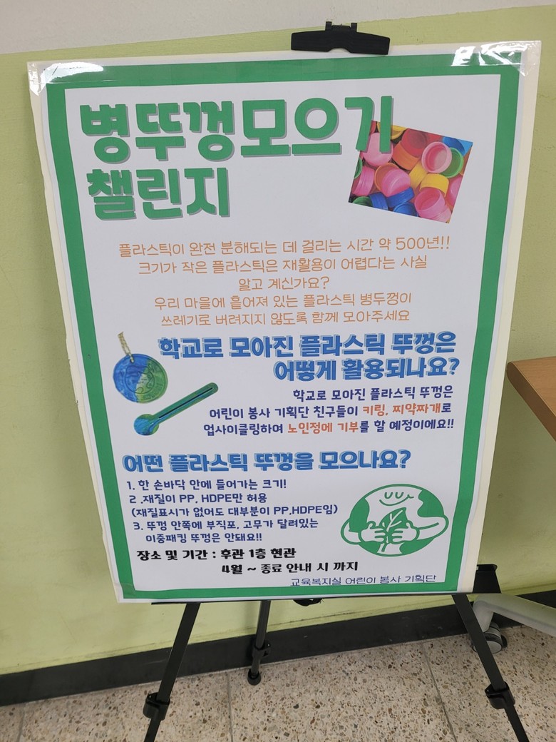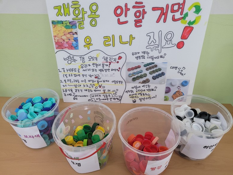 ‘어린이 봉사 기획단’은 환경 문제에 대한 학생들의 관심이 높아짐에 따라, 학교 내에서 실천 가능한 봉사활동을 고민하던 중 플라스틱 병뚜껑 재활용 캠페인을 기획하게 되었다. 버려지는 플라스틱 병뚜껑을 모아 재활용함으로써 환경 보호에 기여하고, 자원 순환의 중요성을 알리는 것이 목표다.