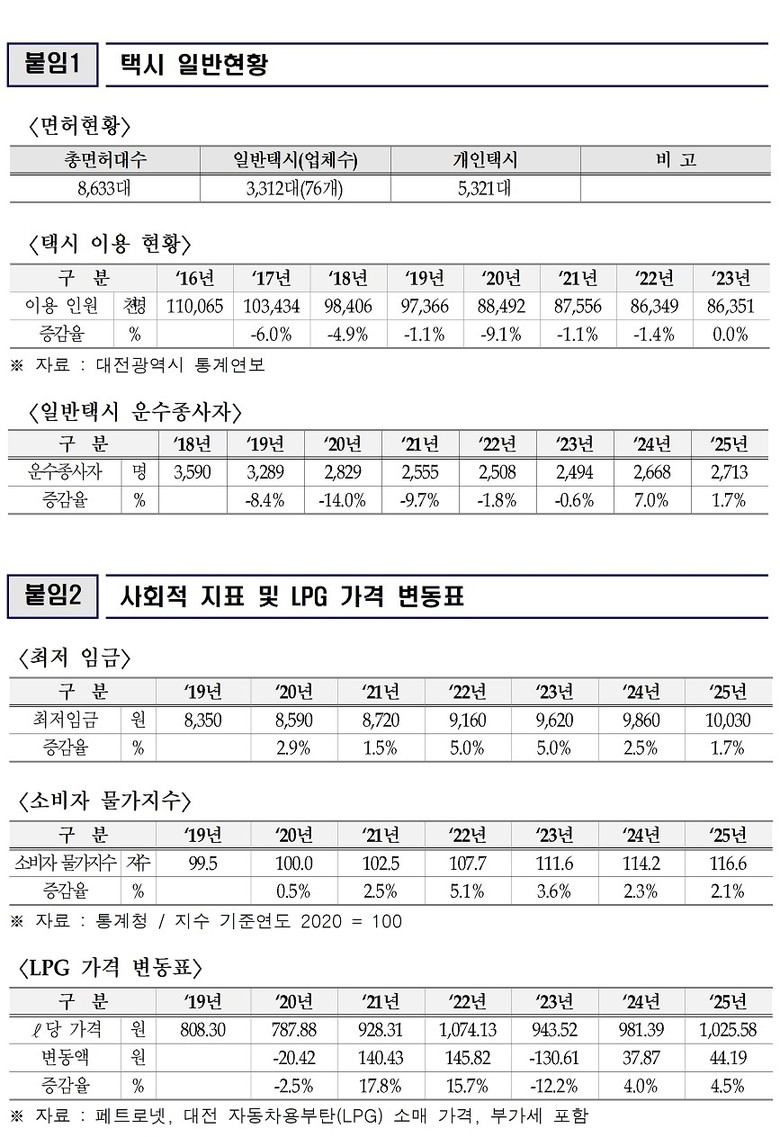 지난 2025년 대구·광주·울산시는 택시요금을 각각 12.6%, 13.3%, 7.5% 인상하였다. 현재 요금을 대전시 평균 주행거리(4.67km)을 기준으로 비교할 경우, 대구·광주·울산시는 대전시 대비 각각 6.3%, 8.9%, 2.5% 높은 것으로 나타났다.