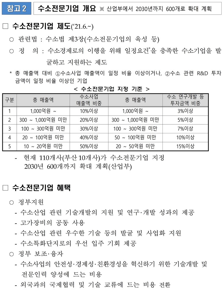 정부는 수소 매출액과 연구개발 투자 비중 등의 요건을 충족하는 기업을 ‘수소전문기업’으로 지정하고 있으며, 현재 전국적으로 총 110개 사가 지정됐고, 이 중 10개 기업이 부산 소재다.
