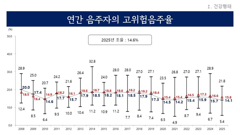 음주 영역에서 ‘월간 음주율’은 전국 중앙값보다 1.2% 높지만 ‘연간 음주자의 고위험음주율’이 14.1%로 최근 3개년 동안 지속적으로 감소하는 추이를 보였으며, 전국 중앙값 15.8%보다 낮았다. 도내에서는 과천시가 5.4%로 가장 낮아 좋은 수준을 보였다.
