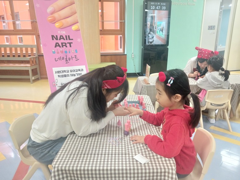 서원대학교 학생들의 재능기부로 운영된 <다채로운 나눔! 컬러놀이>는 네일아트, 페이스페인팅 체험으로 지역사회 연계 기반의 나눔 실천을 경험하도록 구성하여 참여 가족들의 큰 호응을 얻었다.