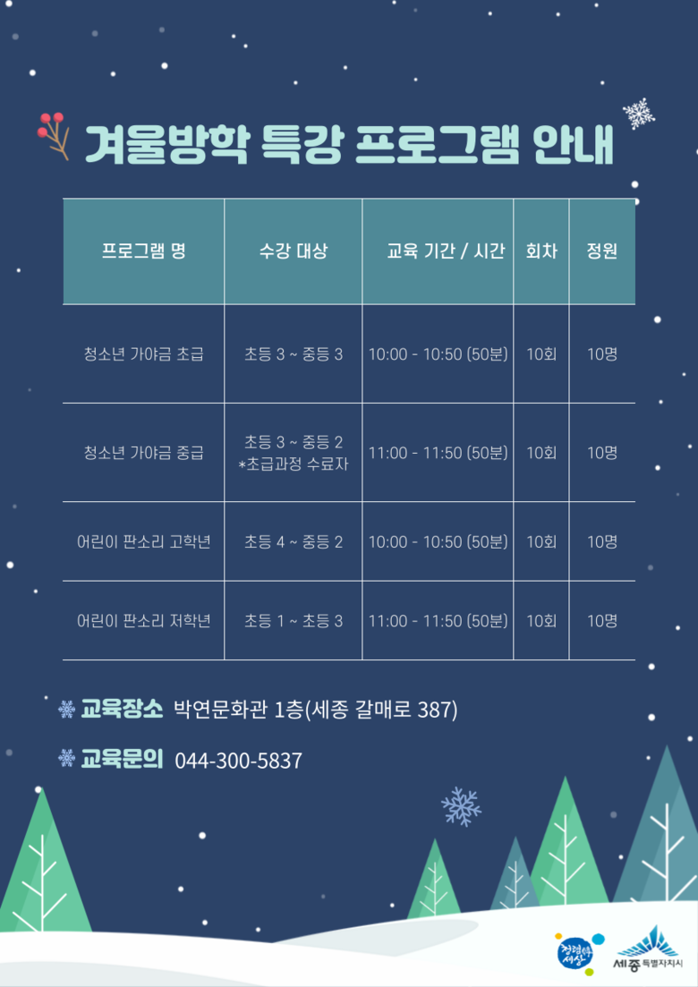 이번 겨울방학 특강은 청소년 가야금(초급·중급)과 어린이 판소리(저·고학년) 총 4개 강좌로 구성됐다.
