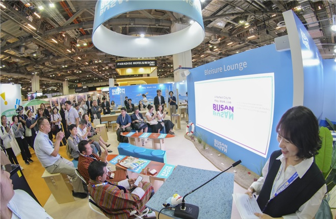대표단은 부산 홍보관인 '부산 블레저(Bleisure)* 라운지'를 운영해 사업(비즈니스) 상담과 기업별 홍보 발표(프레젠테이션), 교류(네트워킹) 이벤트를 펼쳤다.