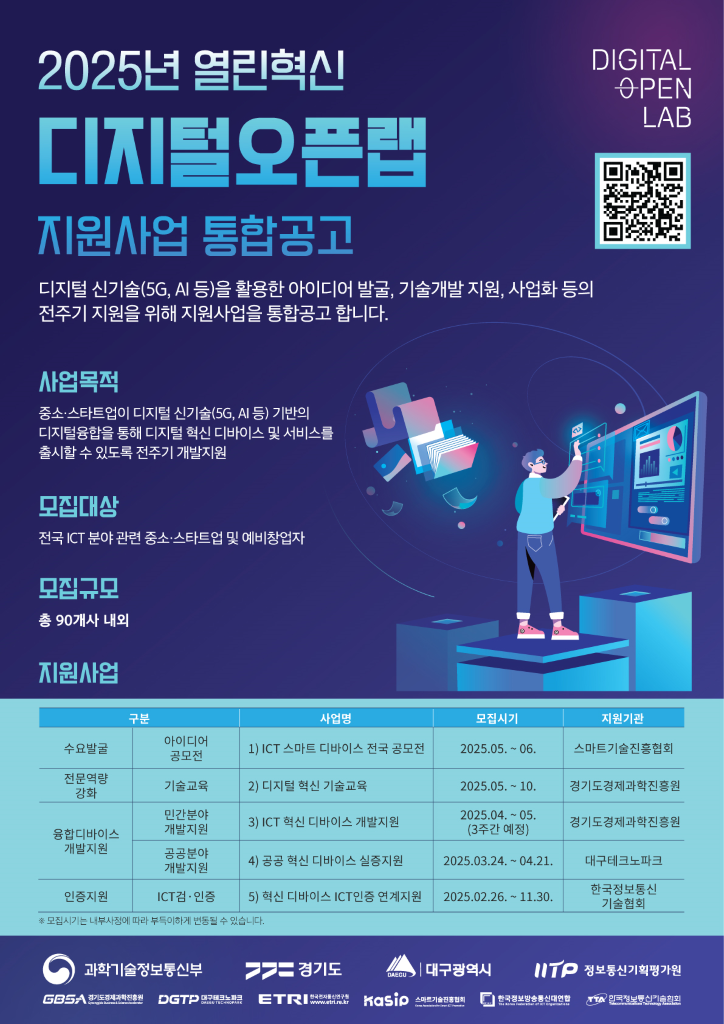 신청 대상은 경기도에 사업장을 둔 중소기업 또는 스타트업이다. 디바이스나 관련 서비스 개발 역량을 보유한 기업이라면 열린혁신 디지털 오픈랩 공식 누리집(digitalopenlab.kr)을 통해 온라인으로 신청할 수 있다.