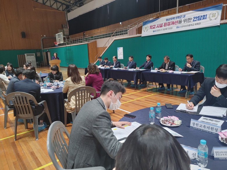 [경남 세계타임즈=최성룡 기자] 경상남도의회 교육위원회 조영명(창원13·국민의힘) 의원이 3월 30일 마산지역 학교시설 환경개선을 위한 간담회를 가지고 각급 학교의 현안을 청취했다. 창원 마산 양덕여자중학교에서 열린 이날 간담회에는 마산지역 5학군(마산회원구 구암동, 합성동, 양덕동, 석전동, 봉암동 일대 학군)의 초‧중‧고교를 대표해 각 학교장과 운영위원장, 학부모회장 50여명이 참석해 시급한 환경개선 현안을 건의했다.